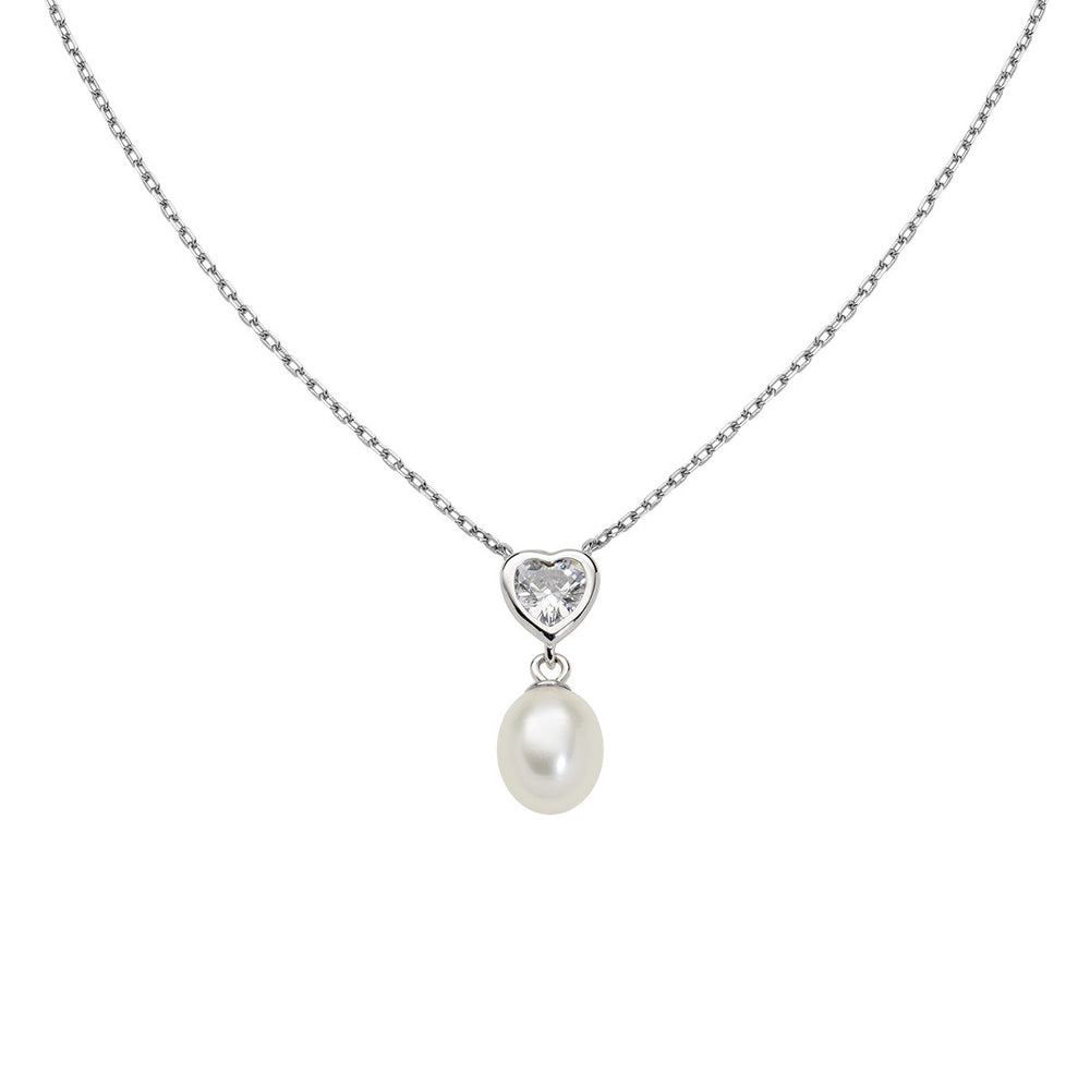 Collana in argento 925 rodiato, pendente con zircone punto luce taglio cuore e perla a goccia di 7 mm.